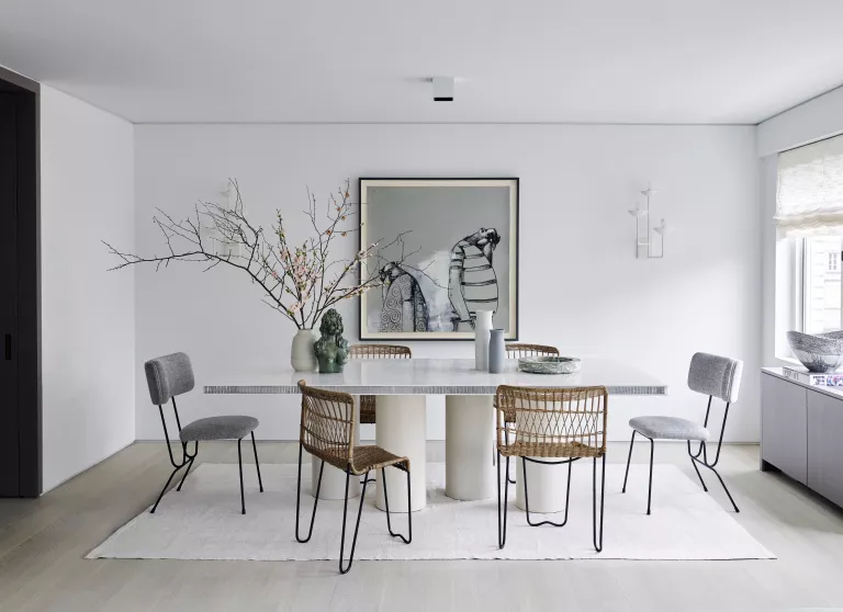 In this dining room color scheme, a variety of different organic textures are used, like the thin-framed, woven chairs and the dry flower arrangement. The entire scheme is tied together well through the use of warm white on the walls.
