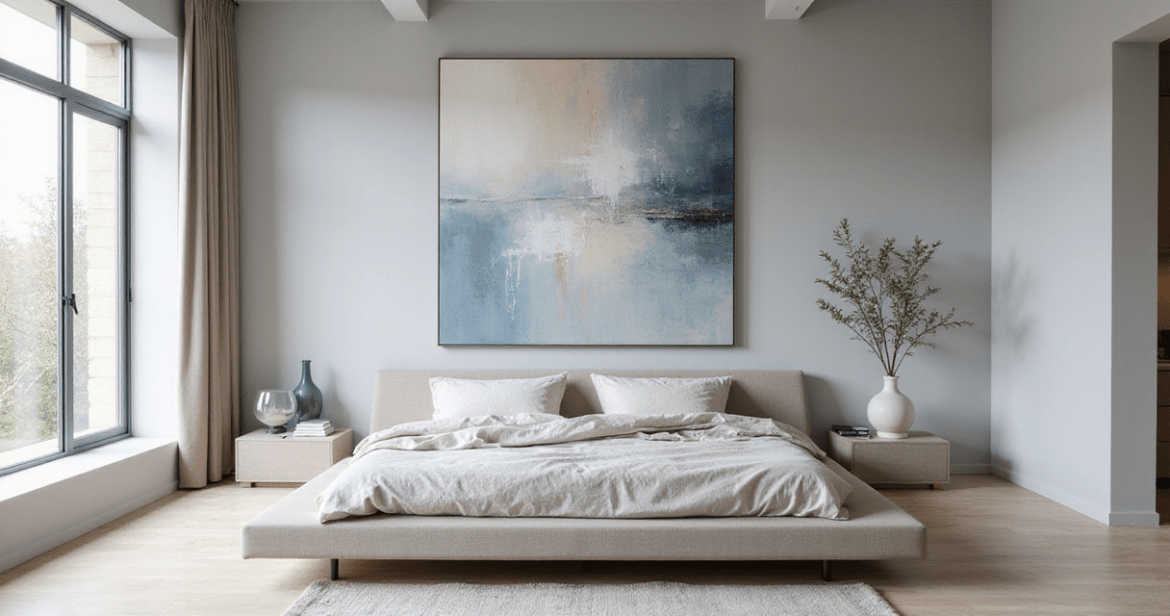 When selecting oversized abstract art, consider your bedroom’s dimensions and the wall where it will reside. Generally, pieces exceeding 36×48 inches qualify as oversized, but context matters. Your artwork should span roughly two-thirds to three-quarters of the wall’s width and should visually dwarf the furniture beneath it. Consider your existing color palette – do you want the art to complement or boldly contrast with your current decor? For bedrooms, calming blues and greens promote relaxation, while energetic reds and oranges inject vibrancy (though they’re less conducive to sleep).