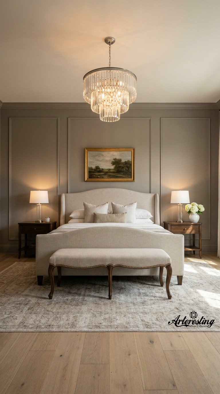 A slim, fabric-covered bench reinforces a classic aesthetic when paired with a crystal chandelier. This choice maintains the formal balance of the room while providing a practical surface for extra linens.