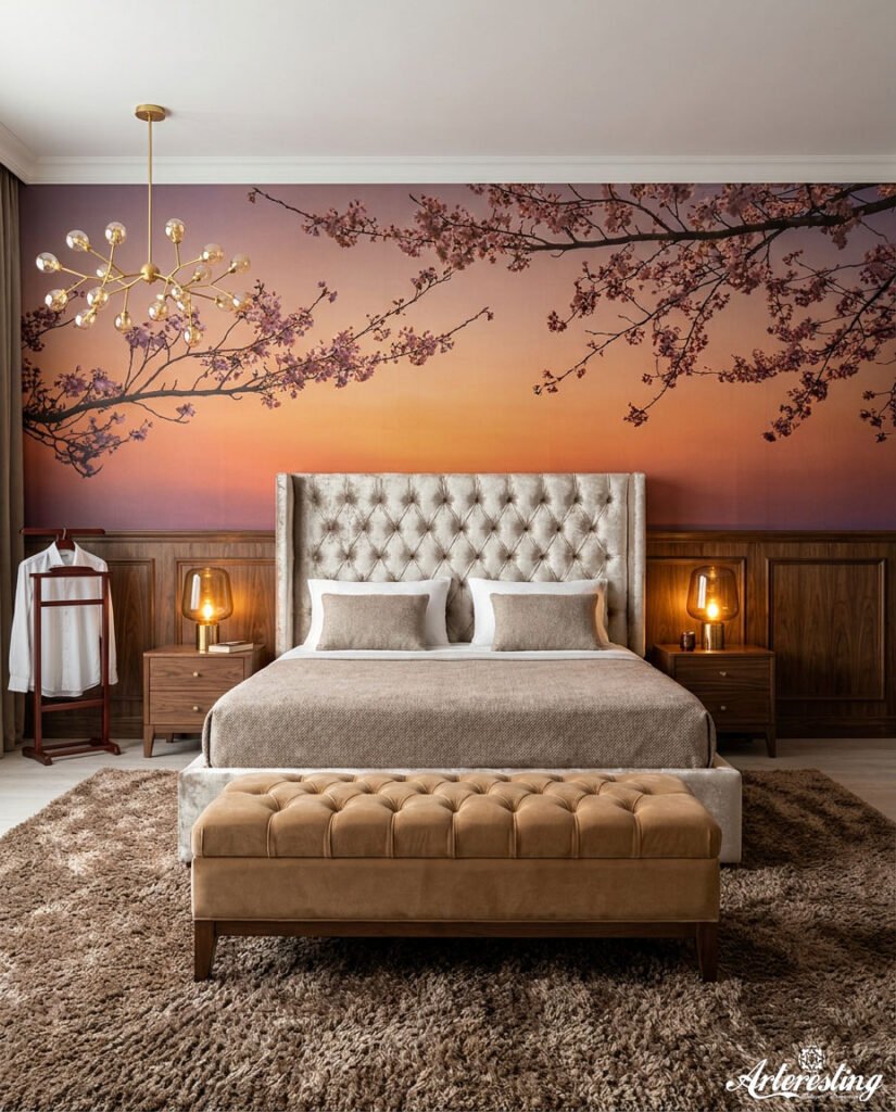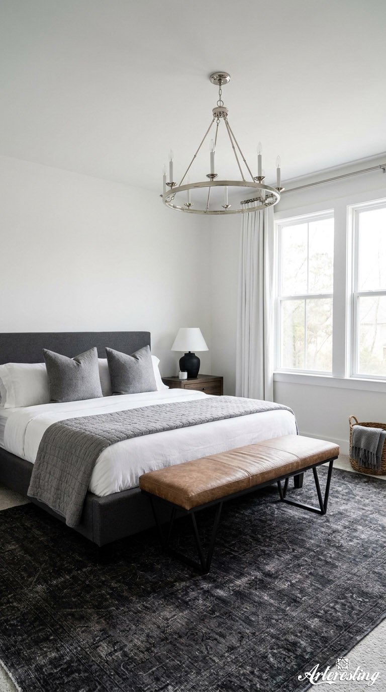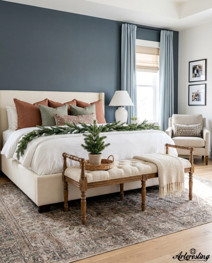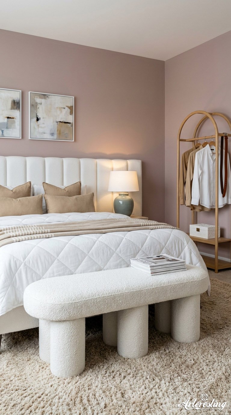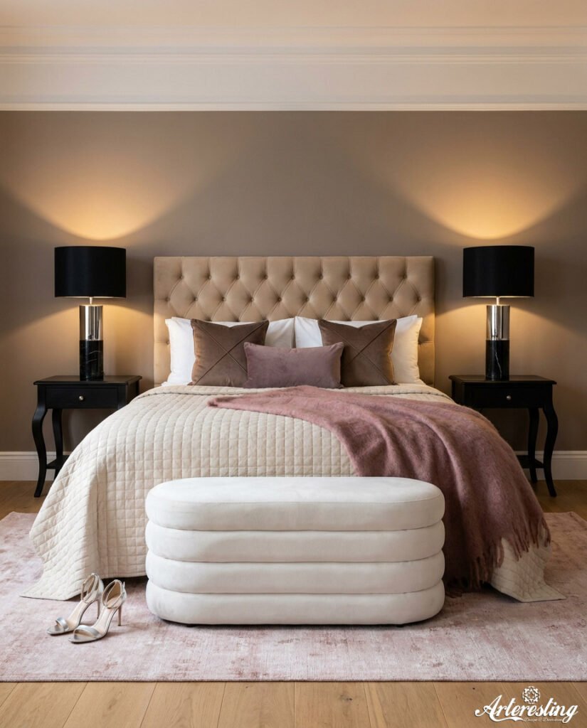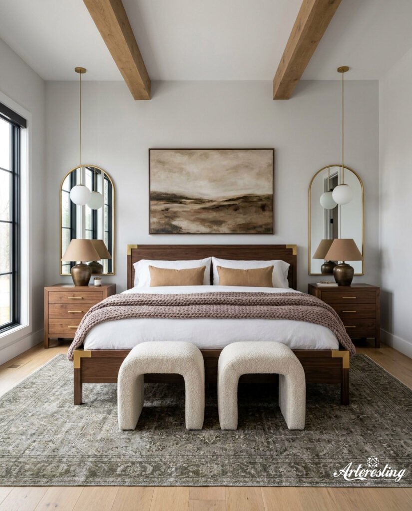 Pairing a light-colored bench with a dark wood bed frame creates a sophisticated visual balance. The contrast prevents heavy wood tones from overwhelming the room’s atmosphere.