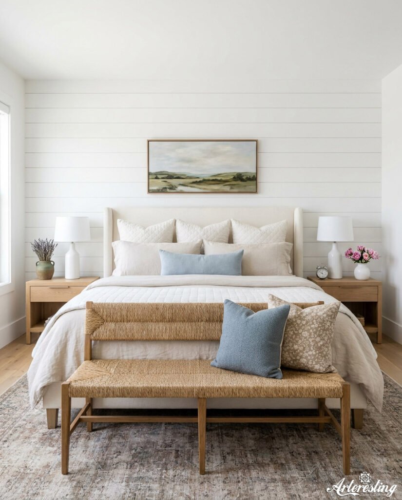 A woven or rattan bench brings a relaxed, airy vibe to the bedroom. Natural fibers are perfect for grounding light-filled spaces and adding a touch of lived-in warmth.