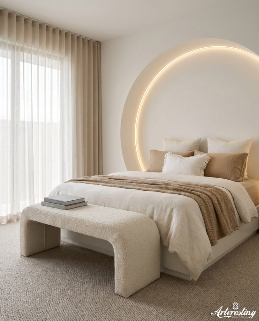 Architectural bouclé pieces with arched forms mirror the lines of curved headboards. This creates a rhythmic design language that makes the bench feel like an extension of the bed’s architecture.