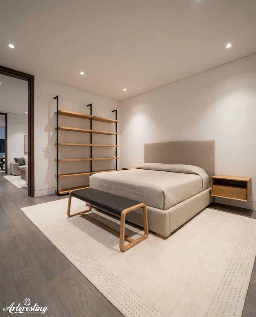 A slim leather bench with an open metal base is ideal for compact spaces. It provides warmth and high-end appeal without adding unnecessary visual weight to the foot of the bed.