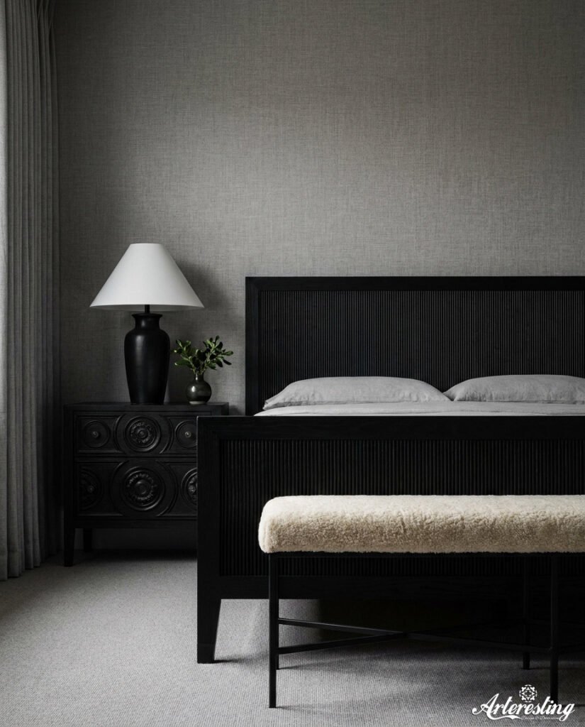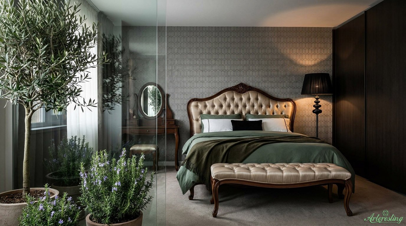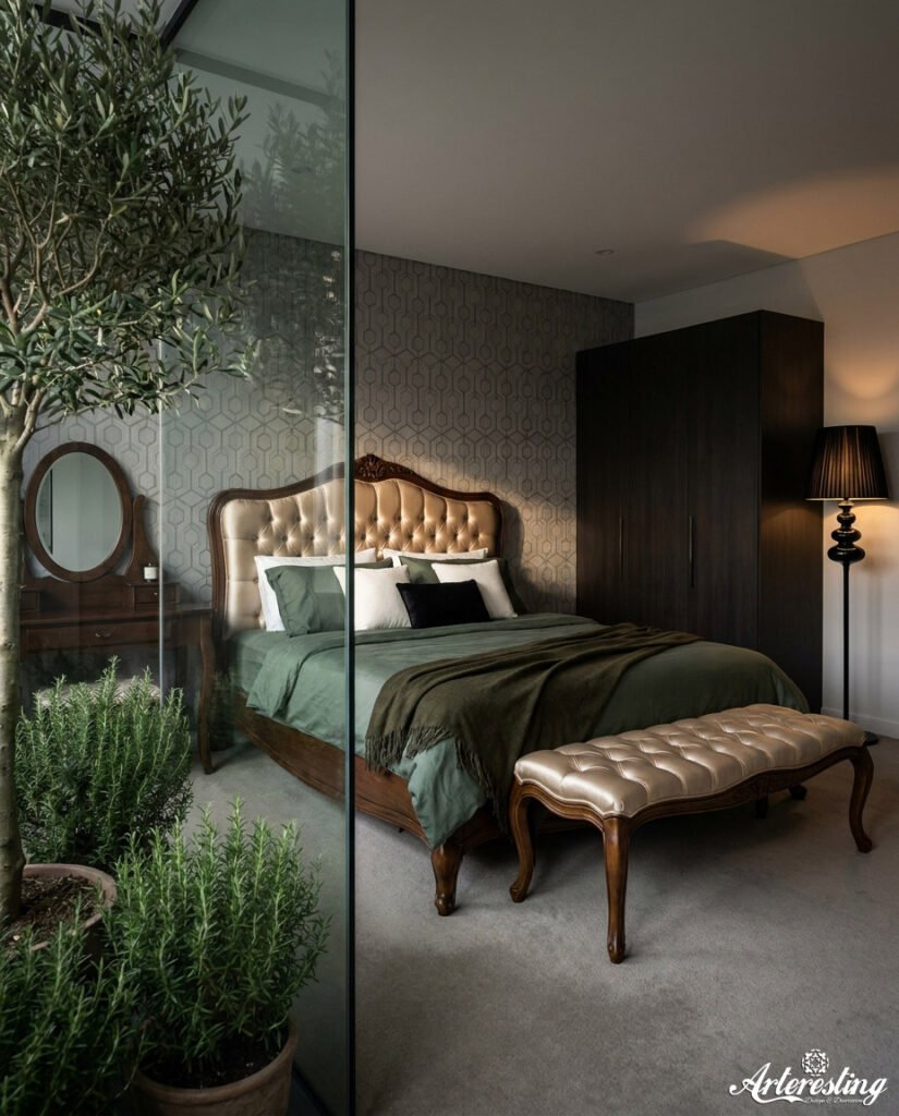 A velvet bench in a deep, rich tone enhances the drama of moody bedroom designs. The material catches the light and adds a sense of intimacy and luxury to the foreground.