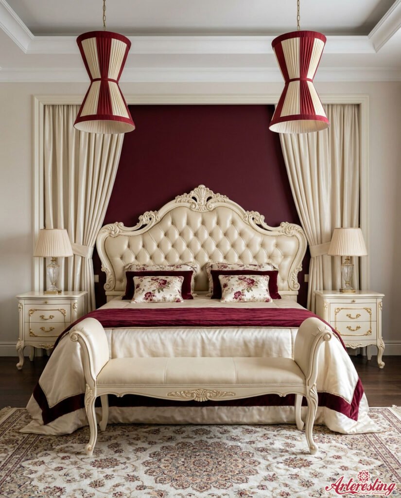 In grand, highly decorated rooms, a bench with a carved frame and ornate cushions completes the formal composition. It reinforces the bed as the primary focal point while maintaining the room’s theatrical scale.