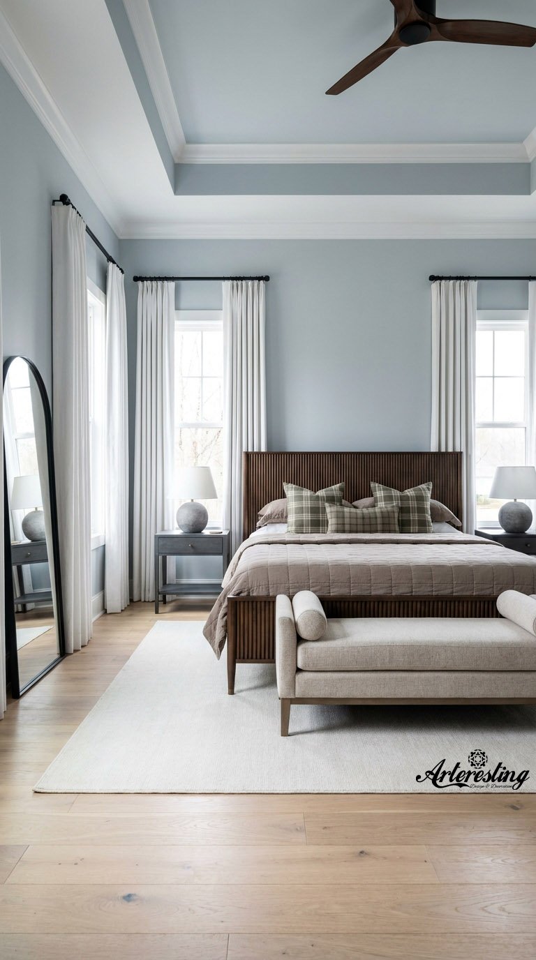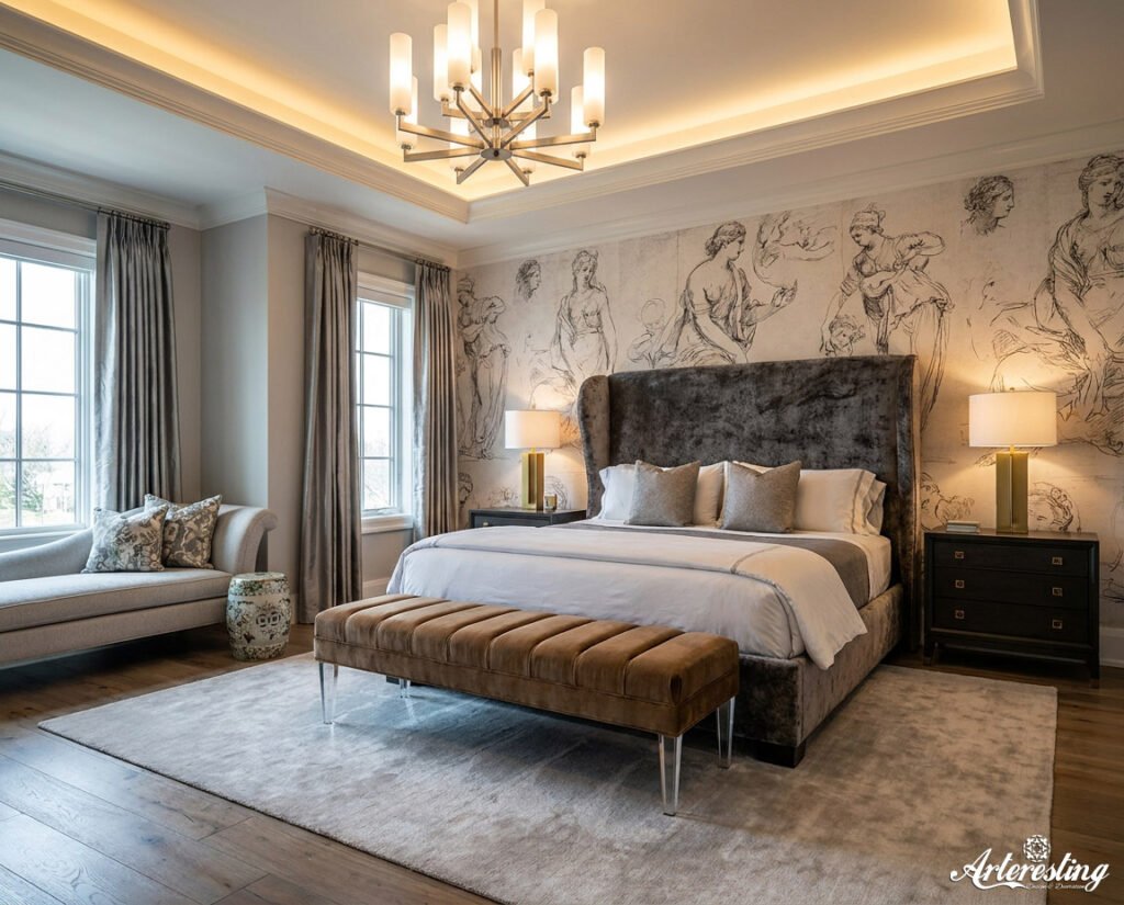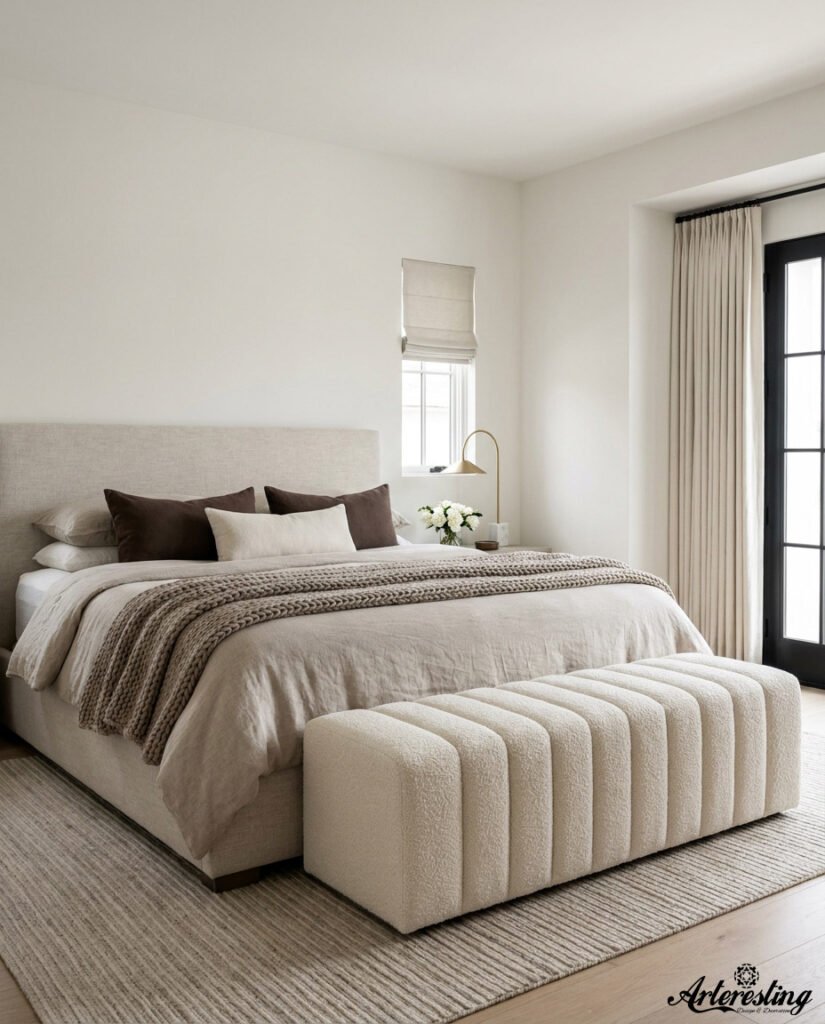 A wide, ottoman-style bench serves as a substantial decorative layer in larger master suites. Its scale connects the bed to the surrounding floor space, making the room feel more cohesive.