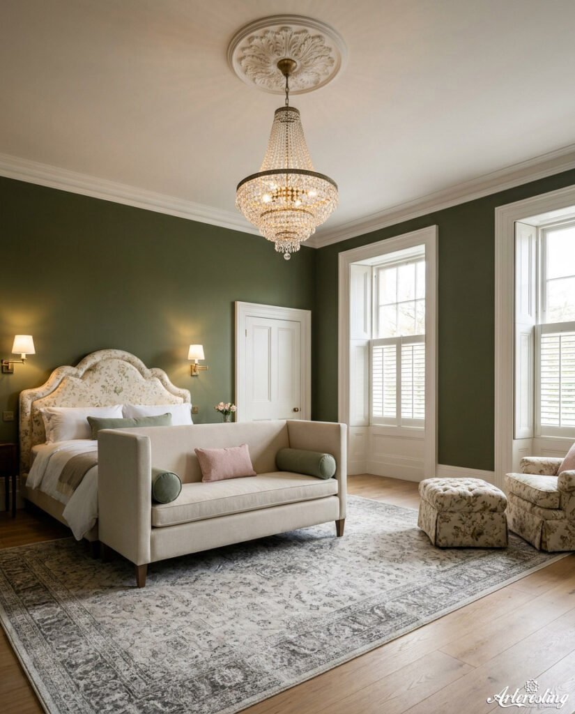 In classic interiors, a narrow bench acts as a visual anchor for the area rug. It completes the axis between the headboard and the rest of the furniture, ensuring the space feels intentional rather than empty.
