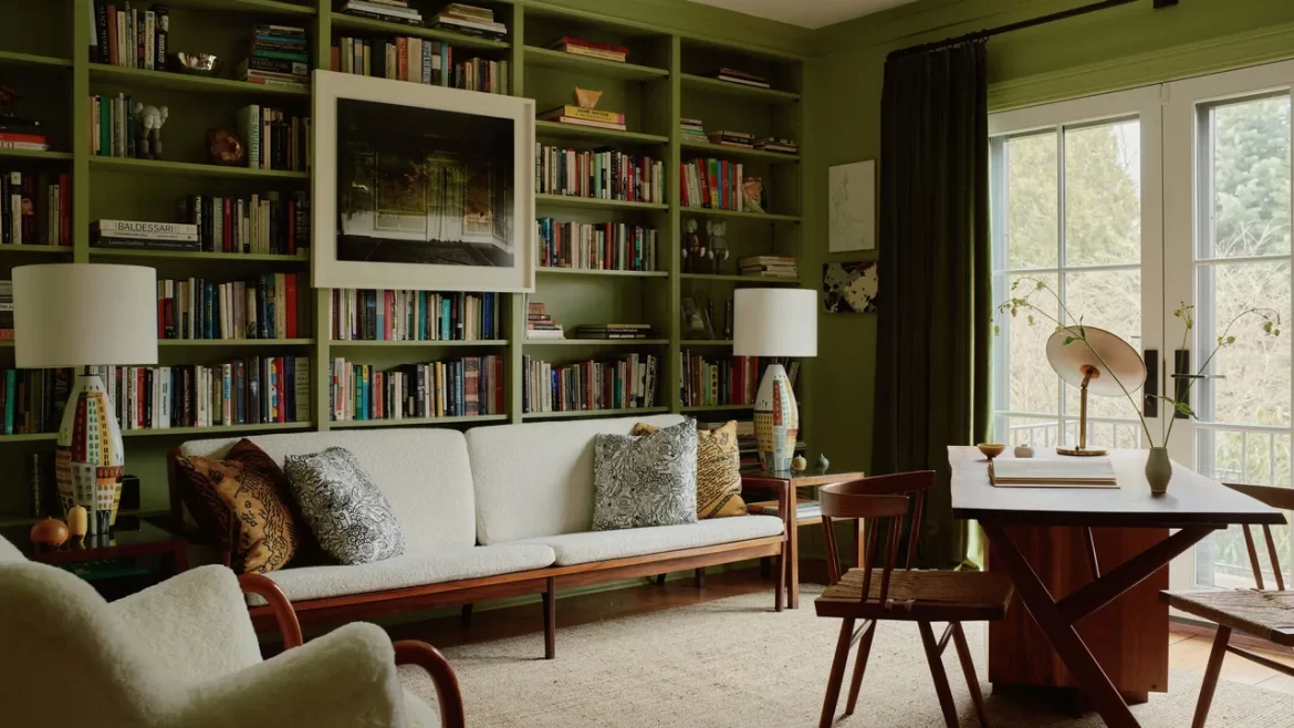 A striking example is designer Clive Lonstein’s home office, where deep green curtains complement Farrow & Ball’s Bancha walls. The effect? A cocooning, serene atmosphere that exudes sophistication.