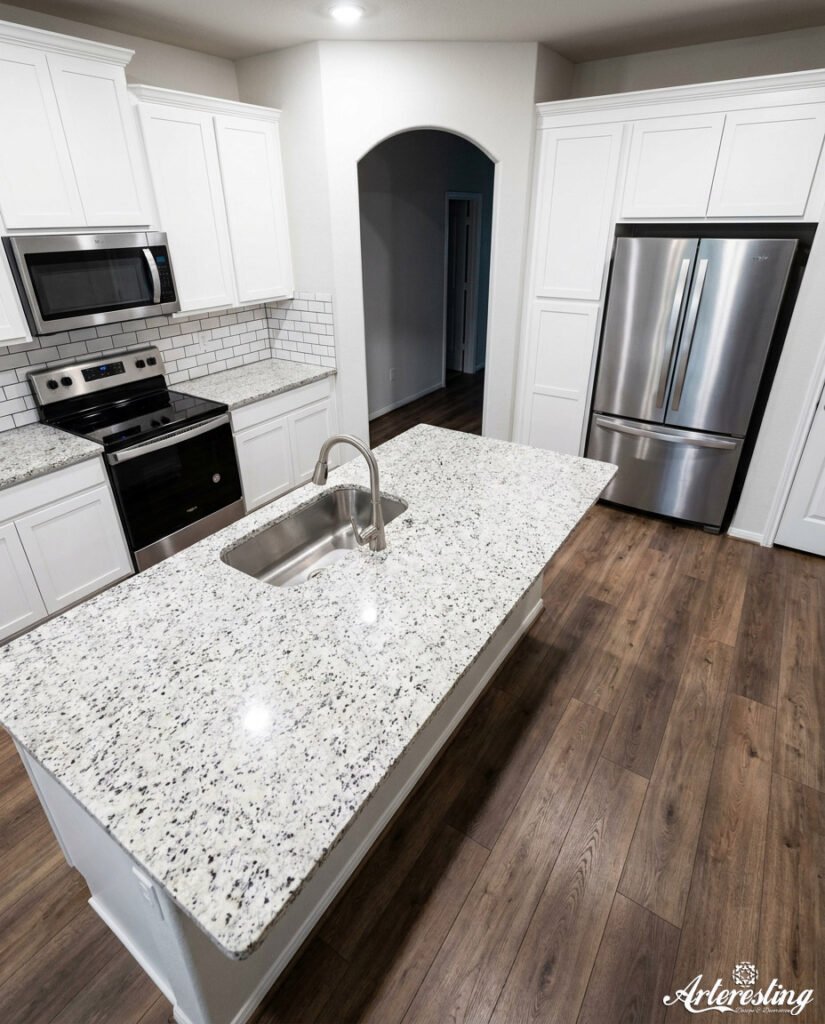 Heavily patterned, frenetic granite countertops are highly distracting and loudly announce a kitchen’s early-2000s origins. These busy surfaces fight with backsplashes and cabinetry, destroying a room’s visual balance.