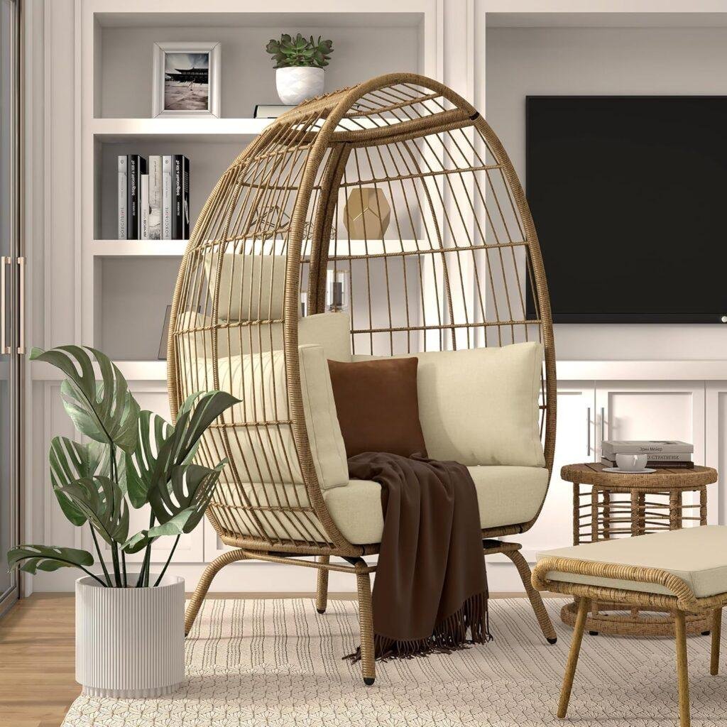 Egg Chair Outdoor, 370lbs Capacity Wicker Patio Basket Chair, All-Weather Oversized Stationary Egg Lounger Chair for Indoor Living Room Outside Balcony Backyard (Beige)