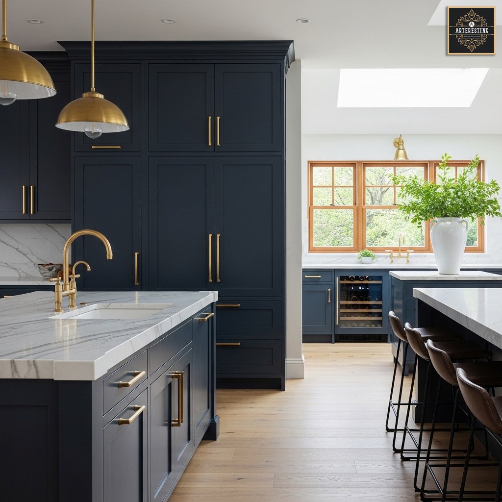 Consider incorporating metallic accents to enhance the richness of charcoal blue cabinetry.